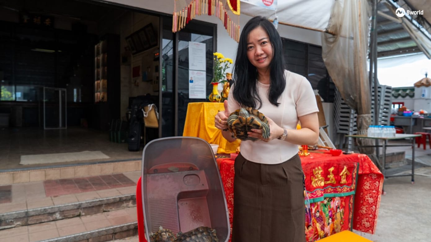 30岁左右的黄琬嫃则和妈妈、阿姨和弟弟一起前来祈福,她带着五岁大的马尔济斯,阿姨林妍伶则带着三只宠物乌龟,希望它们平安长大。