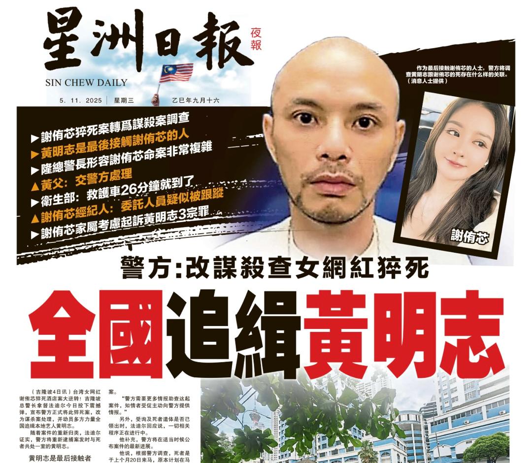 《星洲日报》11月5日的晚报封面刊登黄明志的警局照。(图:网络截图)