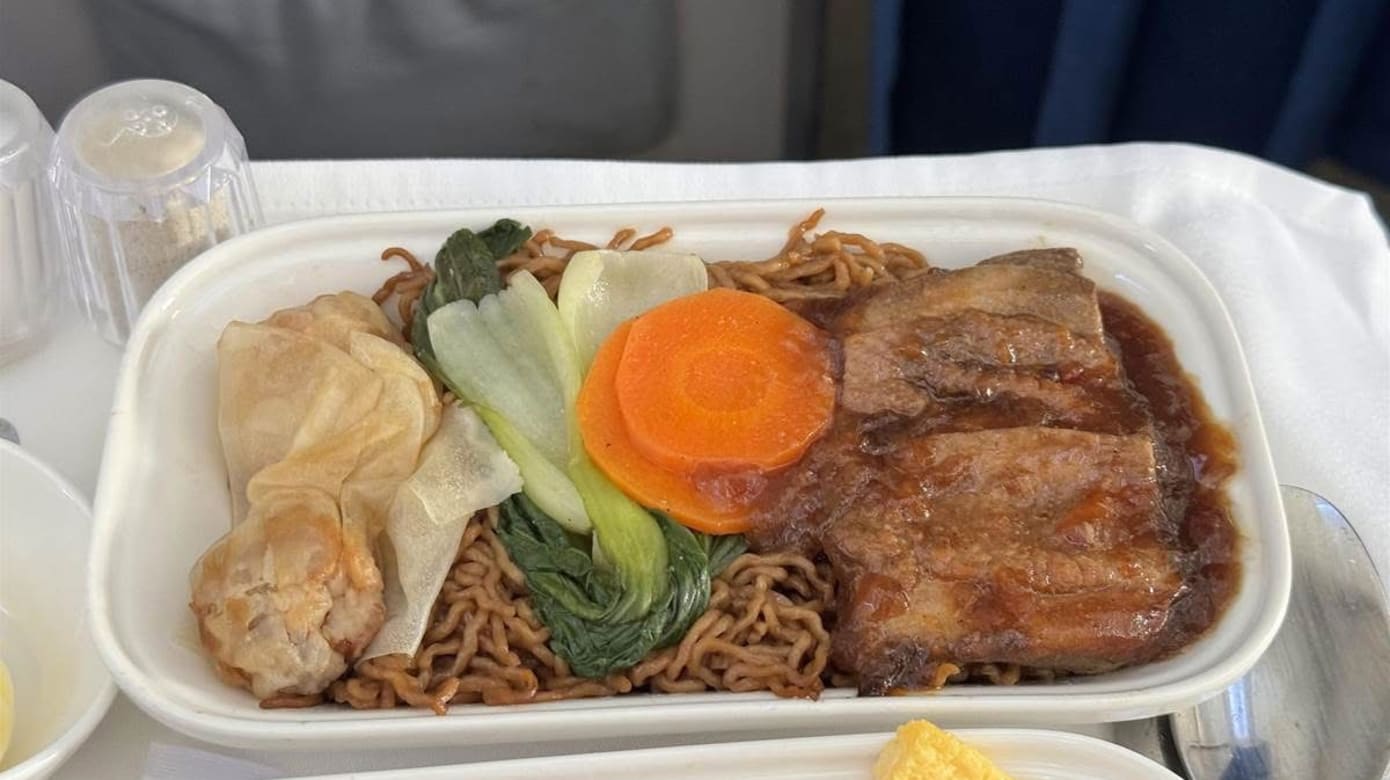 更让他惊讶的是,这些主菜甚至不在这趟航班的菜单上。原来,这些都是前一趟吉隆坡飞清迈航班的餐点,意外被他全数尝遍。
