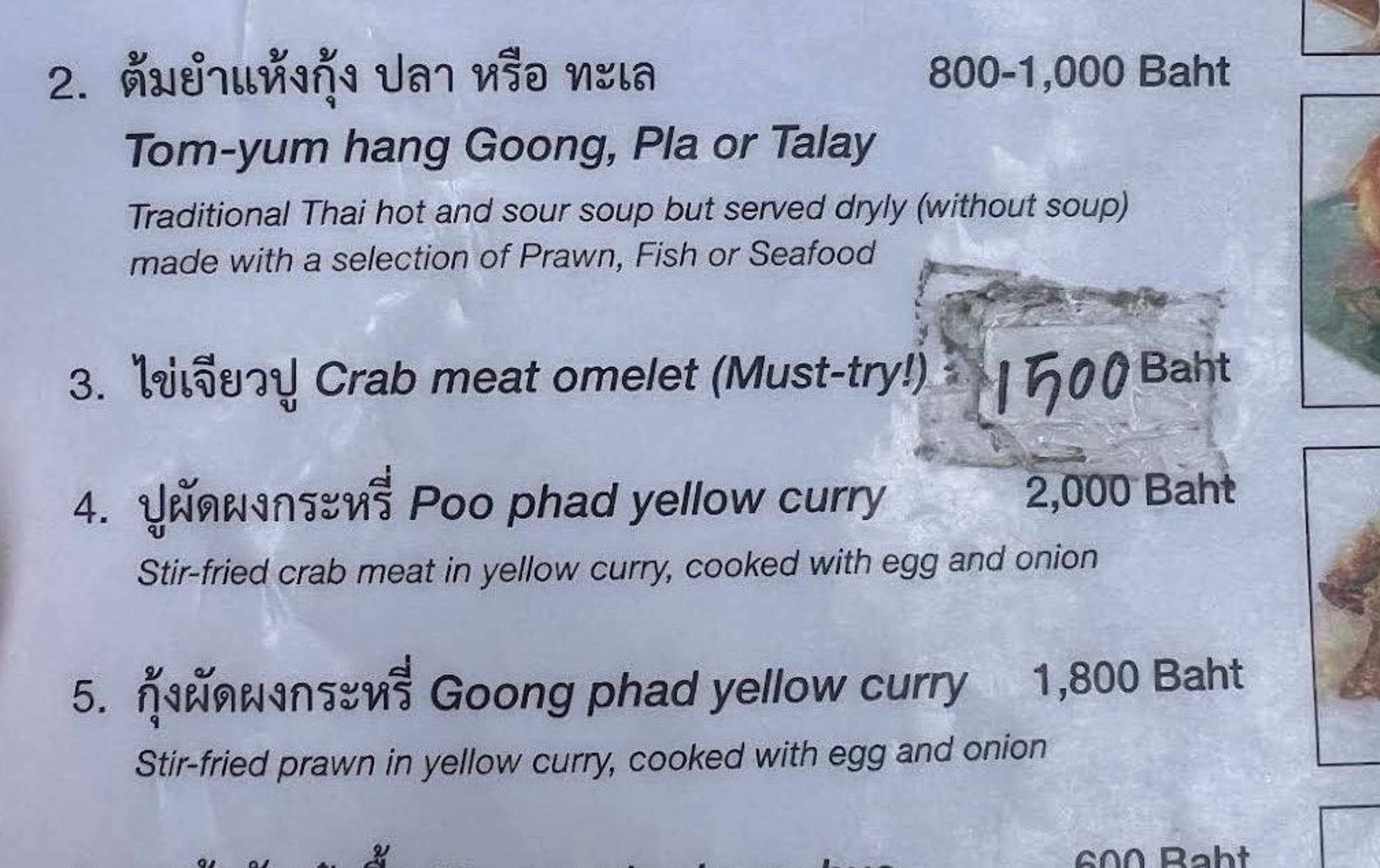 菜单上蟹肉煎蛋卷标价为1500泰铢(约59新元)。(图:曼谷邮报)