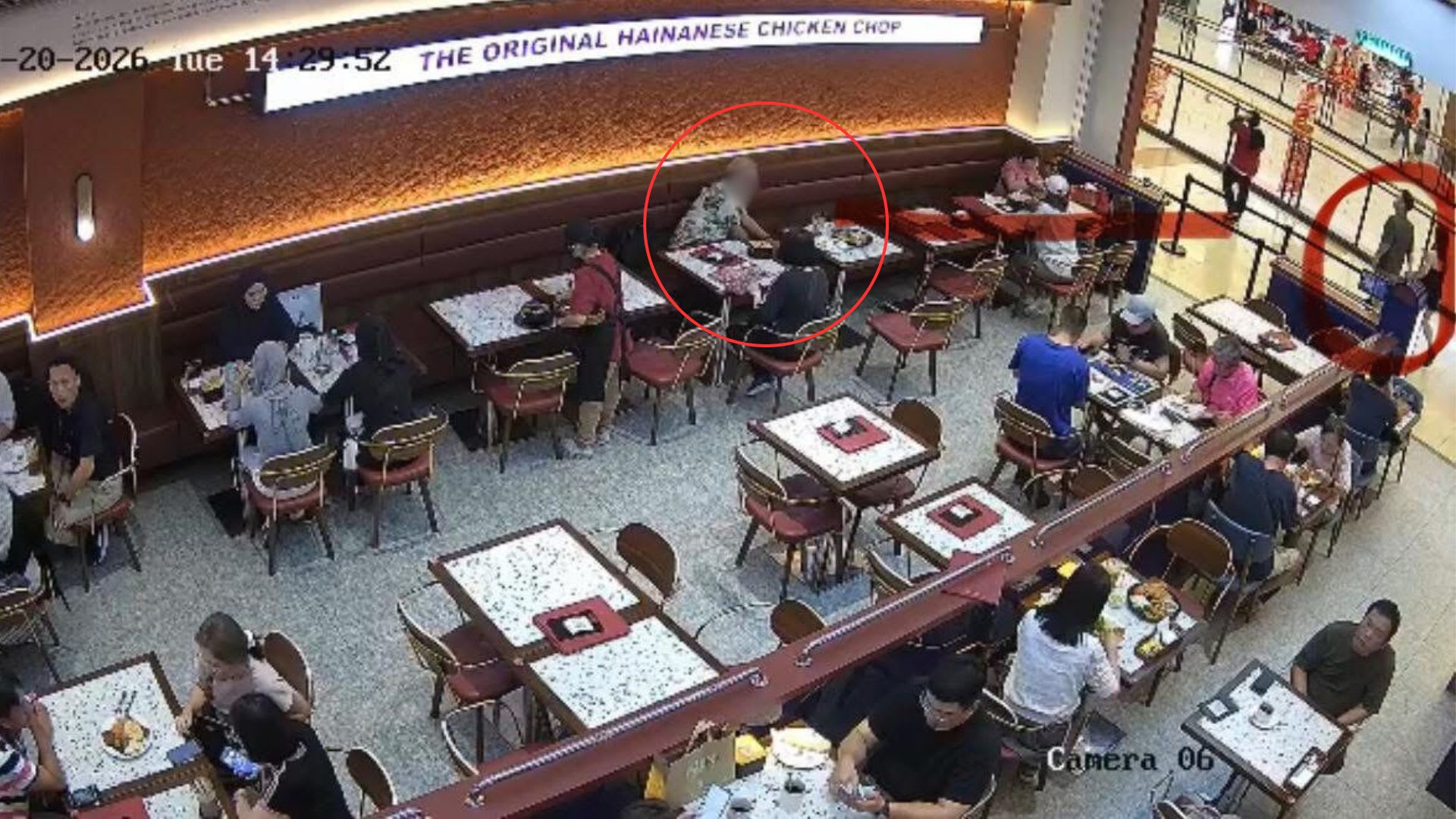 根据餐厅和商场所提供的闭路电视画面,当天下午2点29分,事主和太太吃完午餐后到柜台付钱,才来到餐厅不久的年长夫妻,当时就坐在事主先前坐过的餐桌隔壁。画面显示,坐在靠墙处的老先生在发现椅子上的钱包后,先是一阵迟疑,几秒后才弯身并伸手拿走钱包。