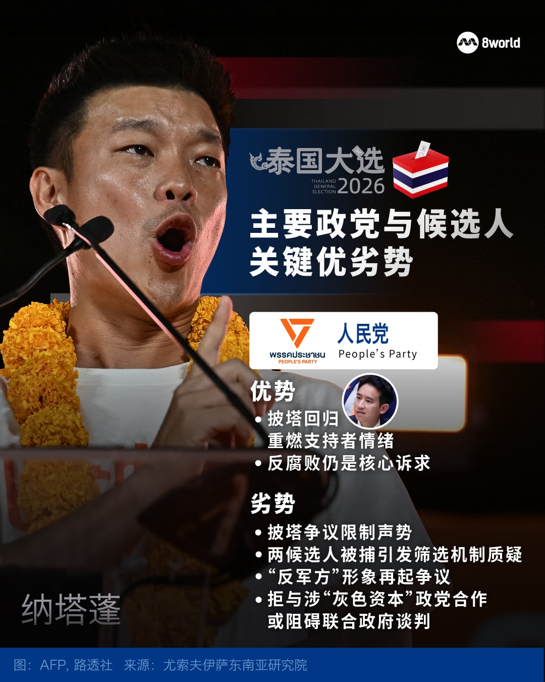 他指出,人民党前领导人皮塔(Pita Limjaroenrat)的回归,在一定程度上重新凝聚了支持者的士气;不过,部分候选人卷入司法争议,也引发外界对候选人筛选机制的质疑。