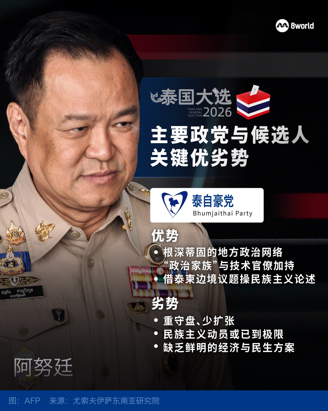 至于为泰党(Pheu Thai Party),麦明辉认为,其首相人选裕差南(Yodchanan Wongsawat)在城市中产阶级中获得一定回响,但其经济政策讯息缺乏连贯性,加上涉及高财政成本的承诺,仍引发选民疑虑。此外,作为达信的外甥,裕差南是否真正与他信家族划清界限,也成为外界关注的焦点。