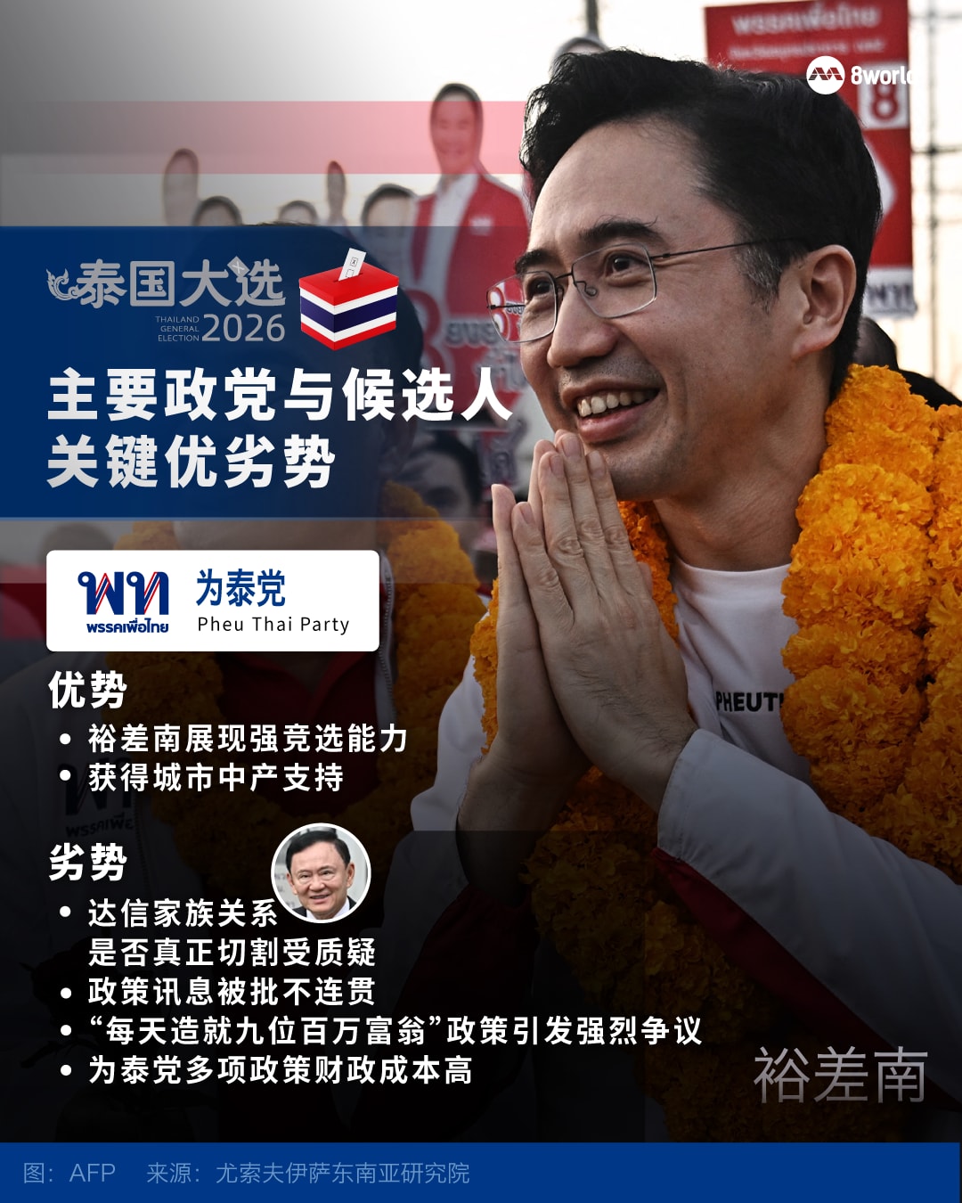 不过,提蒂南指出,此次选举也是25年来首次,正在服刑的前首相他信未在选战中占据显著位置,也不再与其一手打造的政党机器画上等号。取而代之的是,其侄子、拥有扎实学术与技术官僚背景的裕差南,成为焕新后的为泰党的领军人物。