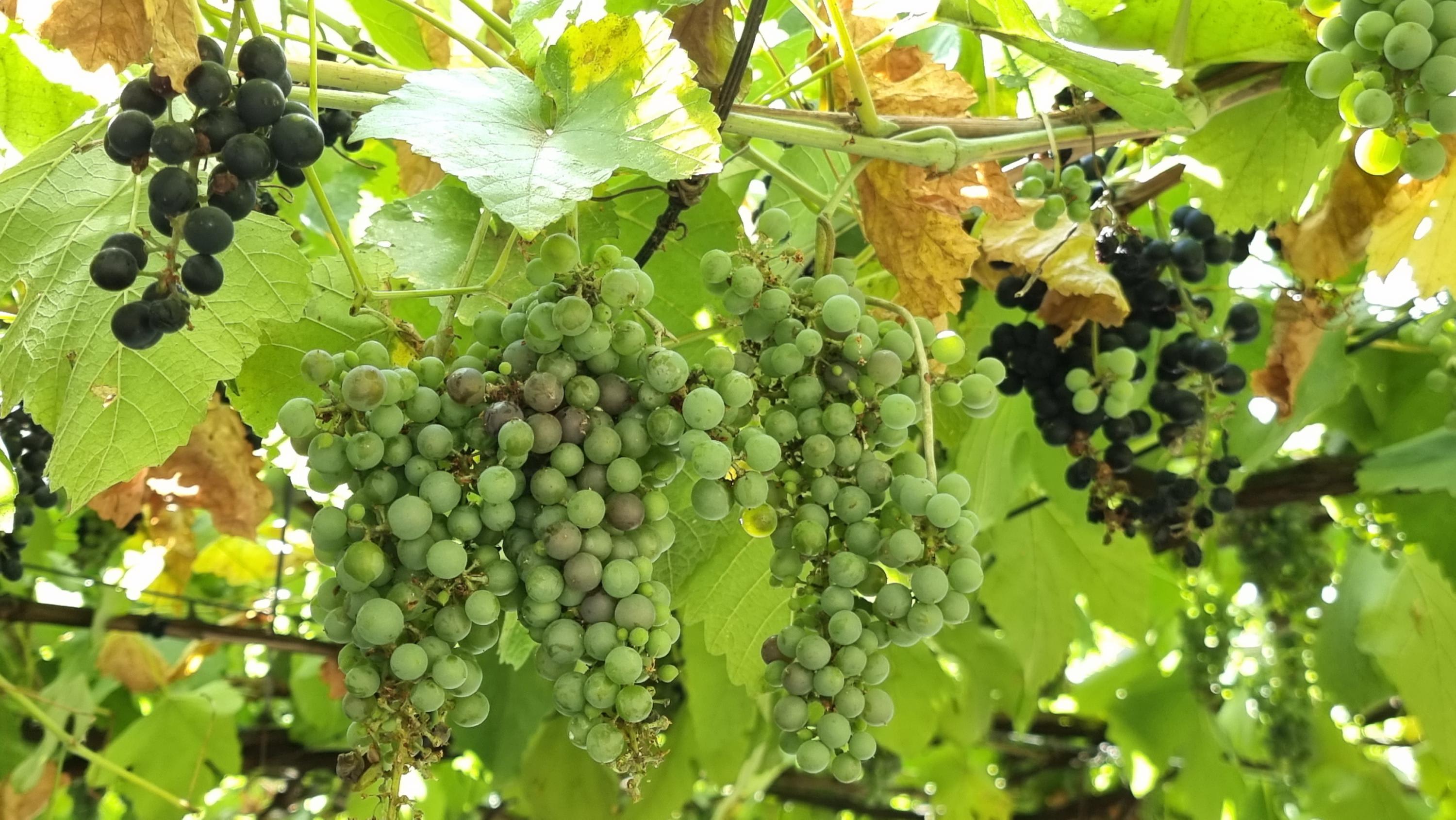 悬吊在高架子上的红和绿葡萄,非常诱人。(图:陈荣光)
