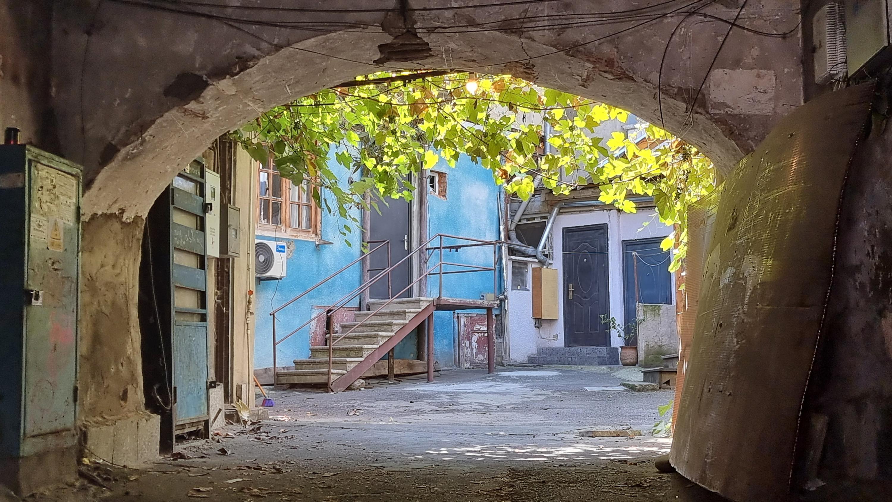 格鲁吉亚首都第比利斯(Tbilisi)的一个住宅公寓庭院内,可看见悬空藤架种植葡萄。(图:陈荣光)