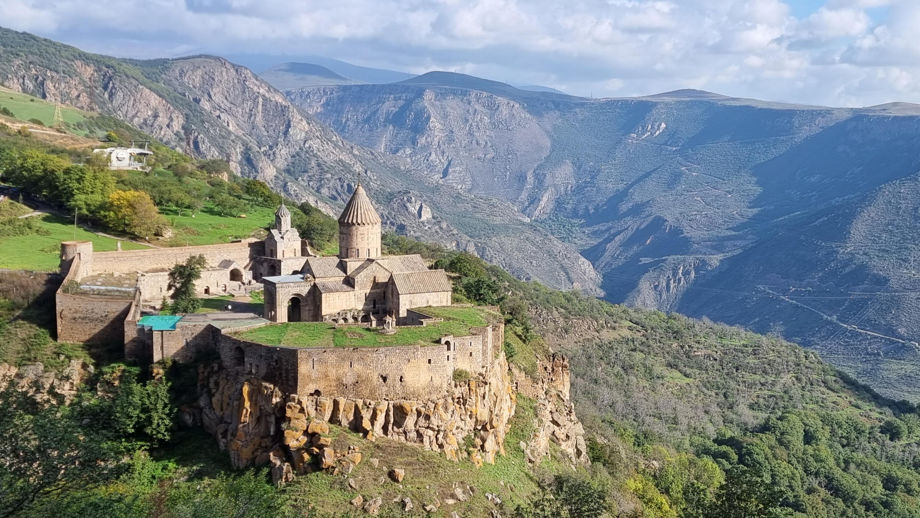 亚美尼亚的塔特夫修道院Tatev Monastery,建于9世纪,矗立在沃罗坦河(Vorotan River)深谷的边缘。古时候,寺院内设酿酒室,生产的葡萄酒足够供应修道院的僧侣和居民饮用。(图:陈荣光)
