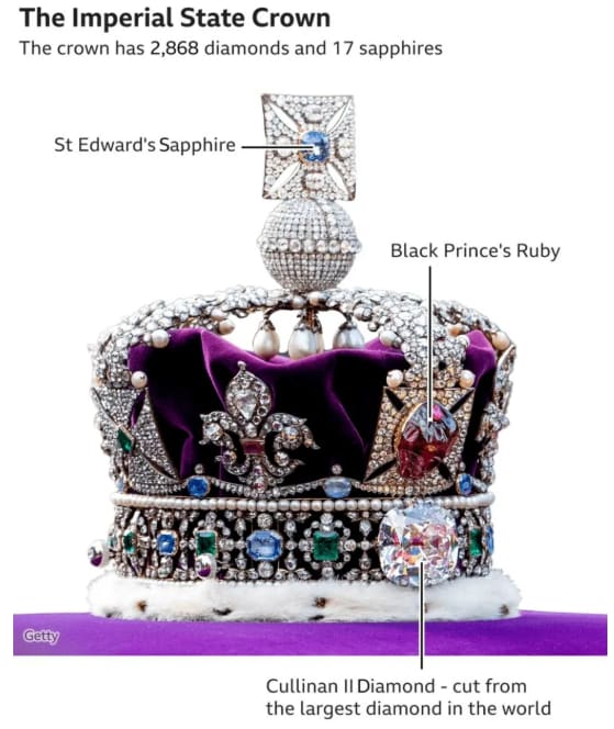 该冠冕制作于1937年,镶嵌超过2800颗钻石、蓝宝石、祖母绿及红宝石等宝石。(图:英国广播公司)