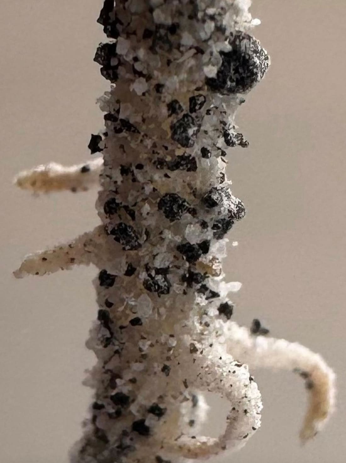 鹰嘴豆根部上如玻璃般锋利的月壤。(图:Jessica Atkin)